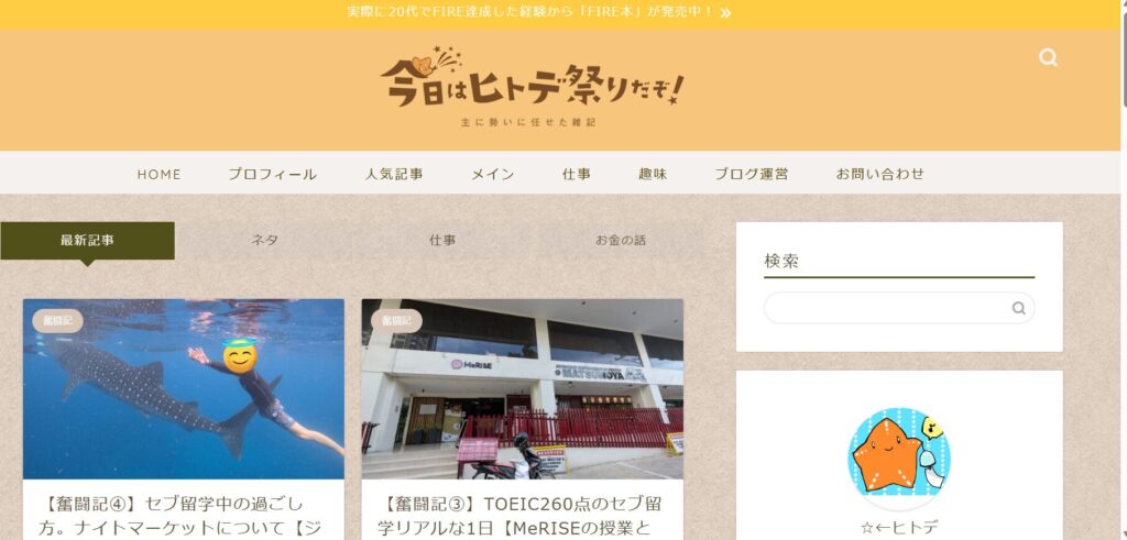このサイトは有名ブロガーヒトデさんの雑記ブログで、旅行先での話などジャンルを絞らず書いています。