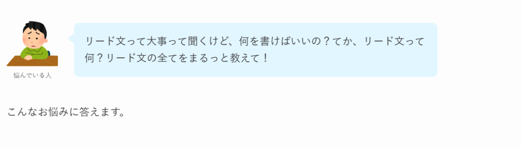 例えば、「リード文 とは」で検索した人は「リード文って、そもそも何?」「リード文の書き方がわからない」という悩みがあるはずですよね。